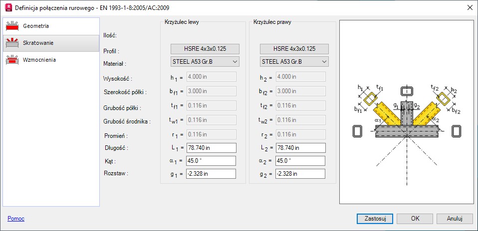 W dolnej części okna dialogowego zdefiniowana może zostać grubość spoin krzyżulców i słupka.