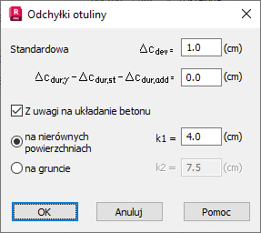 Jeśli norma EN 1992—1—1:2004 AC:2008 jest wybrana, można określić wartości odchyłek otuliny w następującym oknie dialogowym.