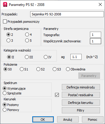 Parametry analizy sejsmicznej konstrukcji zależą od normy sejsmicznej, która będzie stosowana podczas obliczeń konstrukcji poddanej wpływom obciążeń sejsmicznych. Po wyborze francuskiej normy sejsmicznej PS 92 (update 2008) w oknie dialogowym Definicja nowego przypadku lub naciśnięciu przycisku Parametry w oknie Typ analizy na ekranie pojawia się okno dialogowe pokazane poniżej.