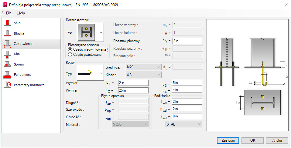 Opcje znajdujące się w polu Kotwy pozwalają na definicję parametrów śrub kotwiących. W polu Typ można wybrać jeden spośród 4 rodzajów śrub kotwiących oraz zdefiniować średnicę śruby i materiał, z którego zostanie wykonana. Pola dotyczące wymiarów kotwy (L1, L2, L3 i L4) pozwalają na definicję długości poszczególnych odcinków śruby. Parametry płytek oporowych i podkładek pod śruby kotwiące należy definiować w polach Płytka oporowa i Podkładka.