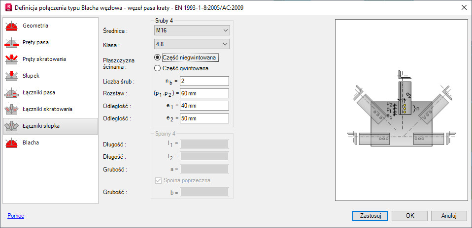- parametrów spoin użytych do połączenia pręta z blachą węzłową (jeśli dla pręta wybrane jest połączenie spawane).