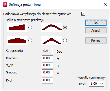 Opcja służy do określenia parametrów dodatkowej weryfikacji prętów zginanych. Jest dostępna po naciśnięciu przycisku Inne znajdującego się w oknie dialogowym Definicja pręta — parametry. Na ekranie pojawia się okno dialogowe pokazane na poniższym rysunku.