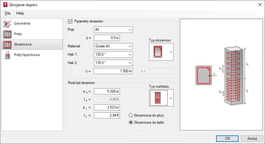 W oknie dialogowym Zbrojenie słupów można zdefiniować parametry zbrojenia poprzecznego (strzemion)