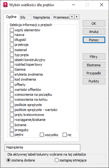 W polu Selekcja informacji o prętach można wybrać do prezentacji w tabeli następujące wielkości dotyczące prętów konstrukcji: