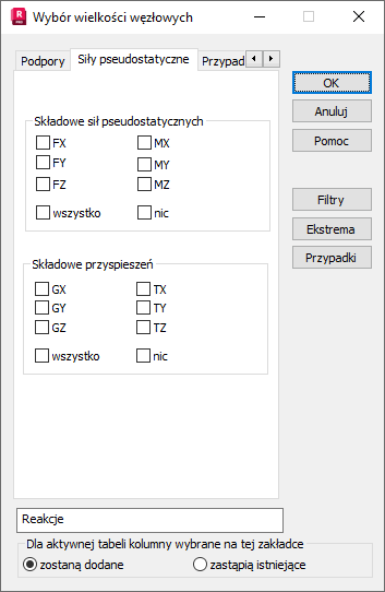 - MX, MY, MZ — jeśli wybrane, do tabeli dodane zostają kolumny dla momentów pseudostatycznych odpowiednio MX, MY i MZ, uzyskanych podczas analizy konstrukcji (siły podane w lokalnym układzie współrzędnych pręta).