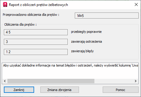 Jeżeli wystąpiły błędy lub ostrzeżenia w trakcie obliczeń prętów żelbetowych, to w dolnej części okna dialogowego pojawia się komunikat informujący użytkownika, w jaki sposób można uzyskać informacje na temat występujących błędów lub ostrzeżeń.
