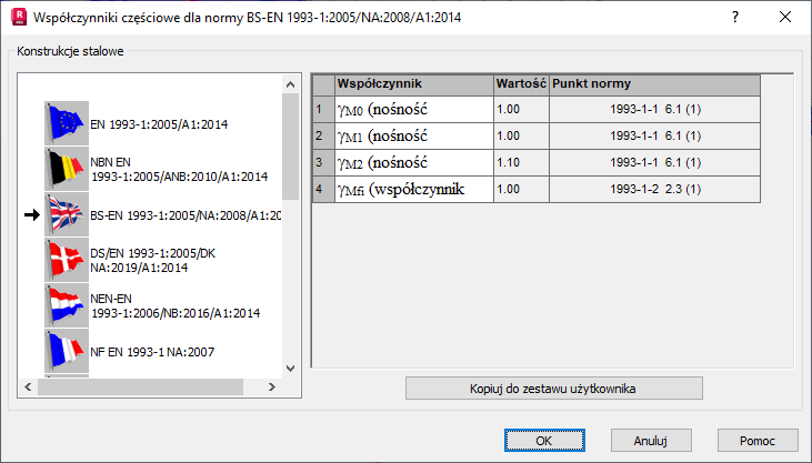 W prawej części okna dialogowego podane są wartości współczynników (ich liczba zależy od wybranego modułu normowego) oraz punkt normy Eurocode, który dotyczy danego współczynnika. Dla norm Eurocode dostępnych w programie Robot wartości współczynników nie są dostępne do edycji; można jedynie przeglądać wartości przypisanych dla danej normy współczynników.