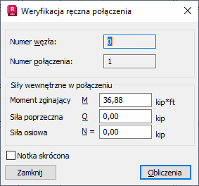 Naciśnięcie przycisku Obliczenia powoduje rozpoczęcie obliczeń wybranego typu połączenia dla danego węzła konstrukcji. Należy podać również siły wewnętrzne działające w połączeniu (N, Q, M).