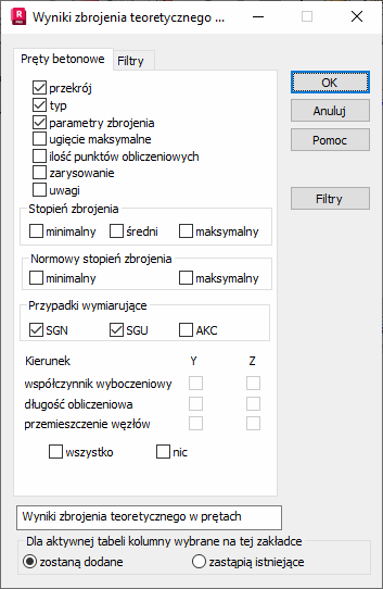 W powyższym oknie dialogowym wybrane mogą zostać następujące wielkości, które będą prezentowane w tabeli wyników zbrojenia teoretycznego (wymaganego) dla prętów konstrukcji: