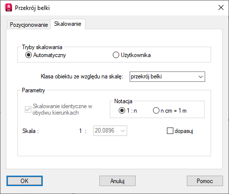 Pole Klasa obiektu ze względu na skalę umożliwia dostosowanie skali wybranego na rysunku obiektu (np. widoku elewacyjnego belki) do skali obiektu wybranego w tym polu (np. skali przekroju belki).