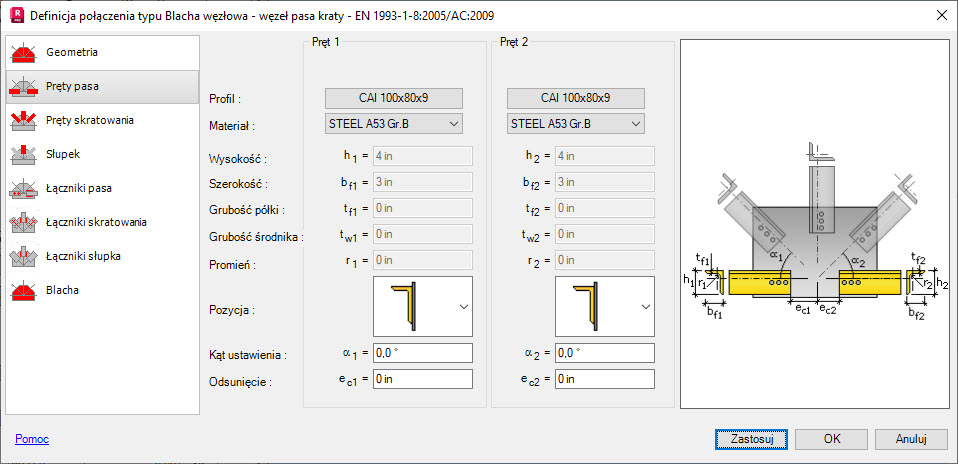 Na zakładce Pręty pasa znajdują się opcje pozwalające na zdefiniowanie podstawowych parametrów prętów pasa dochodzących do blachy węzłowej:
