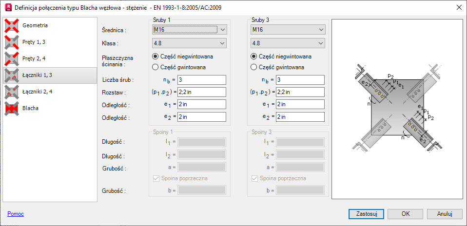- parametrów spoin użytych do połączenia pręta z blachą węzłową (jeśli dla pręta wybrane jest połączenie spawane).