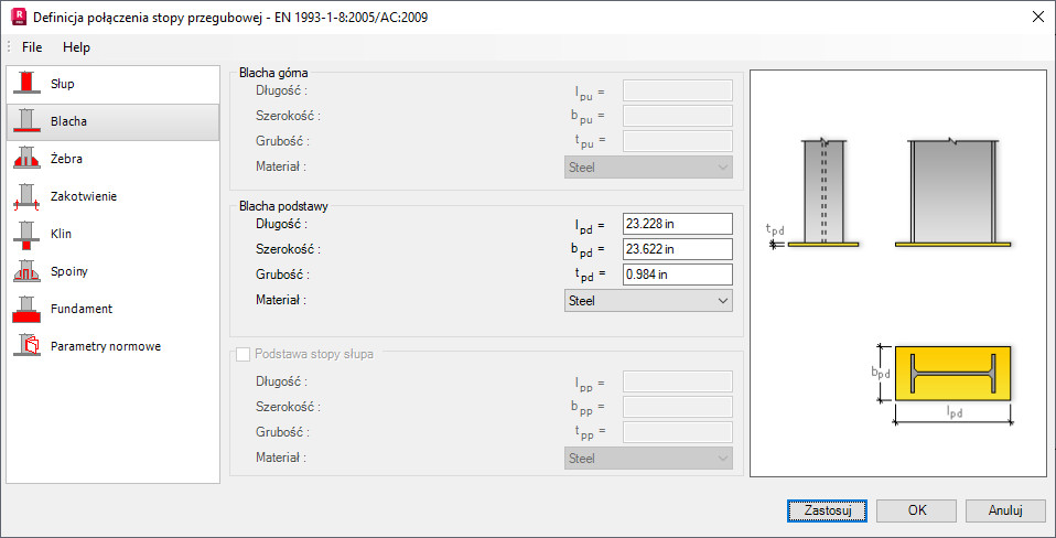 Na zakładce Blacha możliwa jest definicja podstawowych parametrów geometrycznych: