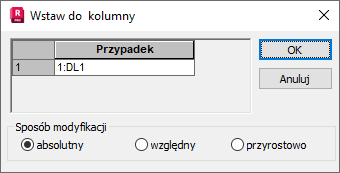 Przykładowo: dostępne są przypadki obciążeniowe nr 1,3,5,6,7. Należy zmienić numery przypadków 5,6,7 na 2,3,4. Aby to zrobić, wybierz pozycje 5, 6 i 7 w kolumnie Przypadek. Kliknij prawym przyciskiem myszy i wybierz opcję Wypełnienie specjalne. Wybierz typ modyfikacji (Bezwzględne) i wpisz 2. Numery przypadków 5, 6, 7 zostaną zmienione na 2, 3, 4. Przypadek nr 3 dostanie pierwszy wolny numer poza blokiem.
