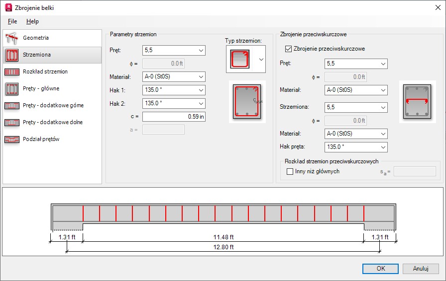 Istnieje kilka parametrów zbrojenia poprzecznego (strzemion) definiowanego w oknie dialogowym Zbrojenie belek: