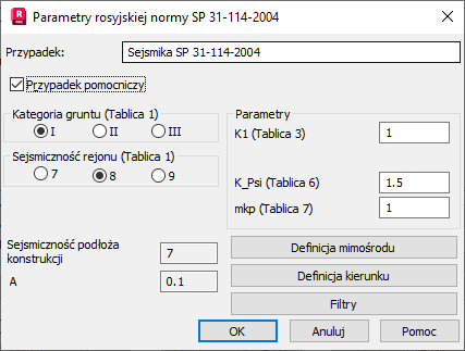 Parametry analizy sejsmicznej konstrukcji zależą od wyboru normy sejsmicznej, która będzie wykorzystywana podczas obliczeń konstrukcji poddanej wpływom obciążeń sejsmicznych. Wybierz rosyjską normę sejsmiczną (SP 31—114 2004) w oknie dialogowym Nowy przypadek lub kliknij przycisk Parametry w oknie Typ analizy.
