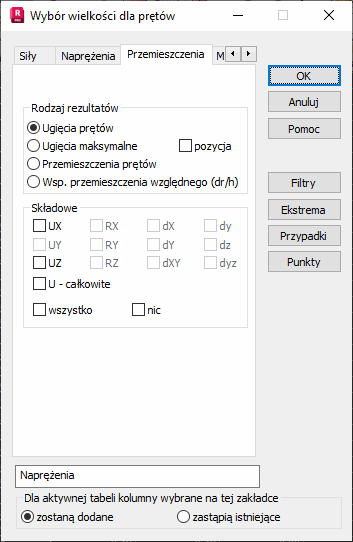Aby wybrać parametry zastąpienia prętów, należy wybrać kartę Przemieszczenia w oknie dialogowym Wybór wielkości dla prętów.