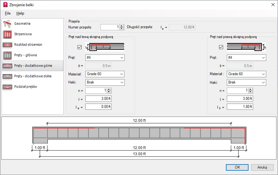 Pręty zbrojeniowe są generowane osobno dla każdego przęsła belki. Parametry prętów dodatkowych górnych obejmują poniższe pozycje: