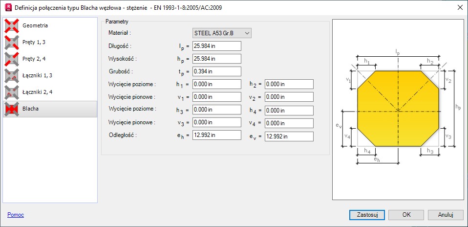 Opcje znajdujące się na tej zakładce umożliwiają definicję parametrów geometrycznych blachy węzłowej; na tej zakładce dokonany może również wybór materiał, z którego blacha ma zostać wykonana.