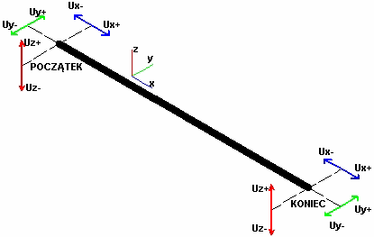 - (Ux, Uy lub Uz) „+” lub „-” — wybranie tej opcji powoduje, że w węźle początkowym lub końcowym elementu pręta zwolnione zostanie przemieszczenie Ux, Uy lub Uz w kierunku zgodnym („+”) lub przeciwnym („-”) do osi lokalnego układu współrzędnych pręta. Na poniższym rysunku przedstawiono możliwe kierunki zwolnień.