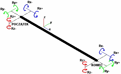 - (Rx, Ry lub Rz) „+” lub „-” — wybranie tej opcji powoduje, że w węźle początkowym lub końcowym elementu pręta zwolniony zostanie obrót Rx, Ry lub Rz w kierunku zgodnym („+”) lub przeciwnym („-”) do osi lokalnego układu współrzędnych pręta (obowiązuje zasada śruby prawoskrętnej). Na poniższym rysunku przedstawiono możliwe zwolnienia obrotów.