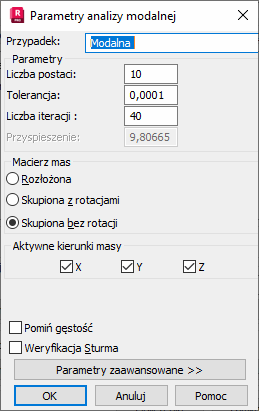 Zawiera parametry dostępne dla analizy modalnej: liczba trybów, tolerancja, liczba iteracji, przyspieszenie ziemskie.