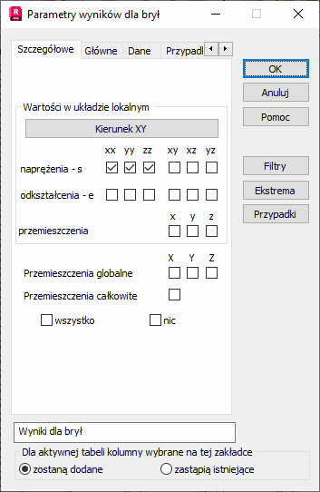 Po wybraniu karty Szczegółowe (bryły) w oknie dialogowym Kolumny na ekranie pojawia się pokazane poniżej okno dialogowe. W powyższym oknie dialogowym wybrane mogą zostać do prezentacji następujące wielkości: naprężenia, odkształcenia i przemieszczenia.