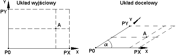 Jeżeli włączona jest opcja Układy ortogonalne bez skalowania, to osie układów współrzędnych (osie x, y, z) są prostopadłe zarówno w układzie wyjściowym, jak i docelowym oraz nie ma skalowania osi współrzędnych (długości odcinków P0—PX, P0—PY i P0—PZ są identyczne w obu układach współrzędnych).