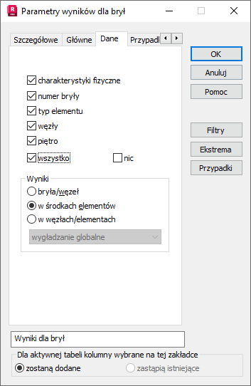 W tym oknie do prezentacji w tabeli mogą zostać wybrane następujące wielkości dla brył: węzły elementów objętościowych, charakterystyki fizyczne, numer bryły oraz typ elementu.