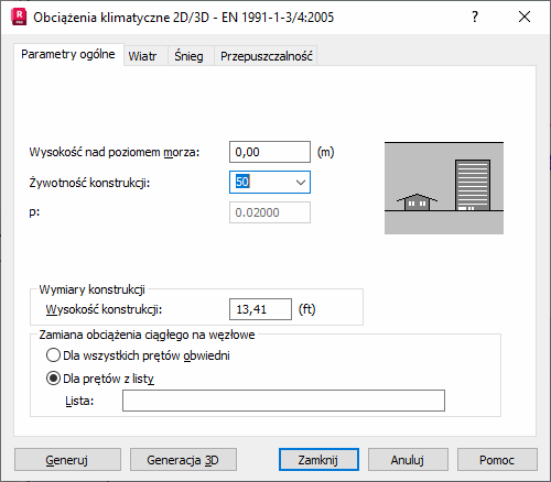 Okno zawiera podstawowe opcje, które są wymagane podczas projektowania konstrukcji przez klimatyczną normę narodową wybraną w oknie dialogowym Preferencje zadania. Po wybraniu przez użytkownika opcji w oknie w prawym górnym rogu okna prezentowany jest schemat danej opcji.
