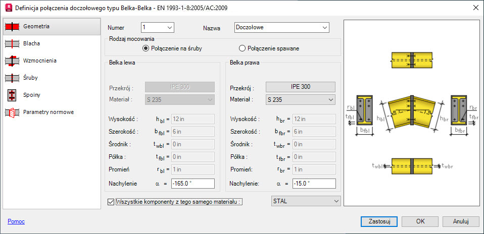 Po zaznaczeniu pola wyboru obok opcji „Wszystkie komponenty z tego samego materiału” wszystkie komponenty połączenia, które umożliwiają wybór materiału (z wyjątkiem połączonych elementów), będą zgodne ze wspólnym wyborem materiału.