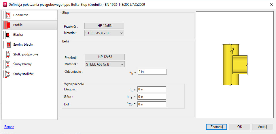 Na zakładce Przekroje możliwa jest definicja przekrojów słupa i belki w połączeniu.