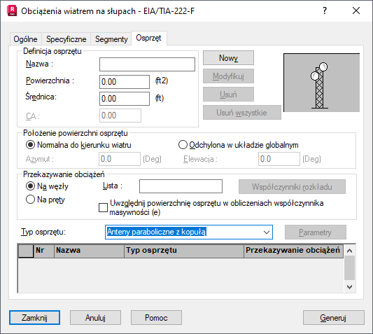- Średnica — średnica anteny należącej do osprzętu (antena musi zostać wybrana z listy Typ osprzętu)