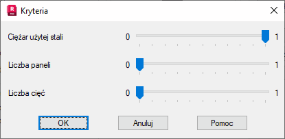 Dla każdej wymienionej powyżej opcji dostępny jest suwak pozwalający określić współczynnik ważności kryteriów optymalizacyjnych; współczynnik ten może przyjmować wartości z przedziału <0, 1>.