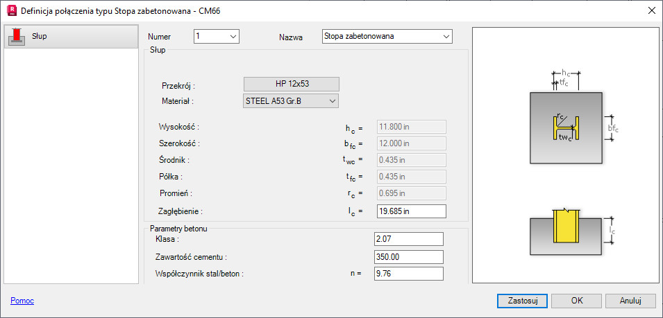 Dodatkowo należy zdefiniować wartość zagłębienia l c trzonu słupa w stopie; wartość ta jest definiowana jako odległość od krawędzi górnej fundamentu do krawędzi górnej płyty stopy słupa.