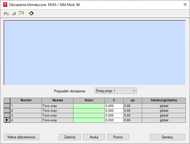Zestaw współczynników służących do określenia obciążenia klimatycznego jest zapisywany w zadaniu, tak aby użytkownik mógł mieć możliwość edycji współczynników i parametrów obciążenia wiatrem lub śniegiem.