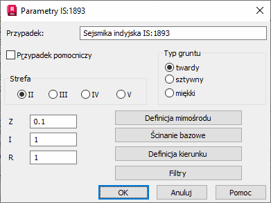 Parametry analizy sejsmicznej konstrukcji zależą od normy sejsmicznej, która będzie stosowana podczas obliczeń konstrukcji poddanej wpływom obciążeń sejsmicznych. Po wyborze indyjskiej normy sejsmicznej (IS 1893) w oknie dialogowym Nowy przypadek lub naciśnięciu przycisku Parametry w oknie Opcje obliczeniowe na ekranie pojawia się okno dialogowe pokazane poniżej.