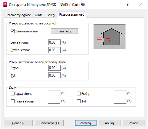 W programie Robot istnieje możliwość bardziej szczegółowych obliczeń przepuszczalności z lewej lub prawej strony konstrukcji poprzez definicję różnych wartości przepuszczalności dla poszczególnych prętów. W tym celu należy wybrać opcję Zaawansowane i kliknąć przycisk Parametry, aby wyświetlić okno dialogowe Parametry przepuszczalności.