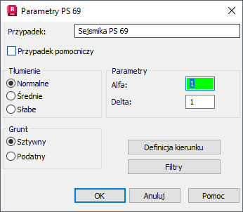 Parametry analizy sejsmicznej konstrukcji zależą od normy sejsmicznej, która będzie stosowana podczas obliczeń konstrukcji poddanej wpływom obciążeń sejsmicznych. Po wyborze francuskiej normy sejsmicznej PS69 ("Regles Paraseismiques 1969 Revisees 1982") w oknie dialogowym Nowy przypadek lub naciśnięciu klawisza Parametry w oknie Typ analizy na ekranie pojawia się okno dialogowe pokazane poniżej.