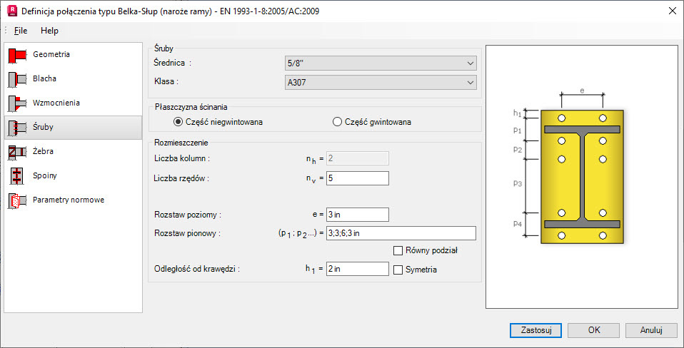 Na zakładce Śruby znajdują się opcje pozwalające na definicję śrub łączących półkę słupa z blachą doczołową.