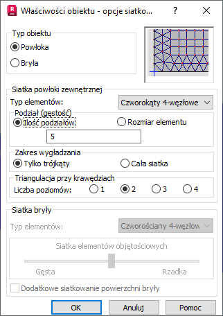 Opcje znajdujące się poniższym oknie dialogowym pozwalają na określenie parametrów siatki powierzchniowych lub objętościowych elementów skończonych. Opcja jest dostępna w modułach Projektowanie powłoki i Projektowanie konstrukcji objętościowej po wybraniu obiektu i wybraniu polecenia Właściwości obiektu w menu skrótów.
