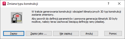 - Zapisz — zapisany zostaje stan projektu konstrukcji po wygenerowaniu obciążeń klimatycznych 2D. Zapisane przez program Robot zostaną zarówno przypadki obciążenia śniegiem i wiatrem, notki obliczeniowe (w postaci zrzutów ekranu), jak i stan wszystkich okien dialogowych (definicja obwiedni, parametry obliczeniowe, definicja geometrii 3D). Następnie program Robot rozpoczyna generowanie obciążeń klimatycznych. Zmiana typu konstrukcji — utworzona zostanie konstrukcja 3D i wygenerowane zostaną obciążenia 3D.
