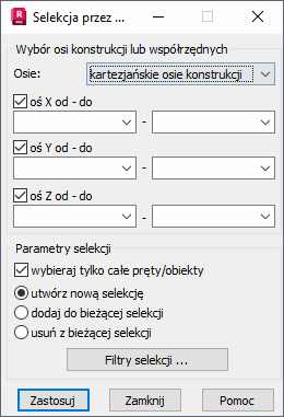 W górnej części okna dialogowego można wybrać typ osi konstrukcji (układ kartezjański lub cylindryczny). Poniżej określony może zostać zakres selekcji elementów konstrukcji wzdłuż osi X, Y i Z globalnego układu współrzędnych. Należy określić początkowe i końcowe położenie osi konstrukcji, podając przedział selekcji prętów lub obiektów.