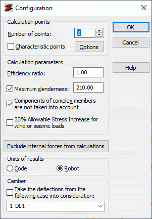 Kliknij przycisk Wyłącz wewnętrznych sił obliczeń, aby otworzyć Wewnętrznych sił nie są brane pod uwagę. To okno dialogowe zawiera opcje, które określają ograniczenia wartości wewnętrznych sił (stąd wartości siły, które są 'nieistotne' dla określonego przekroju może być pominięty). Ponadto, wybrane mogą zostać jednostki dla prezentacji wyników wymiarowania prętów. Wyniki mogą być prezentowane w jednostkach używanych w wybranej normie stalowej, lub w jednostkach używanych w programie Robot.