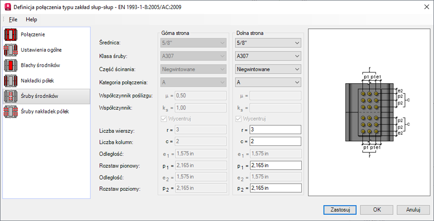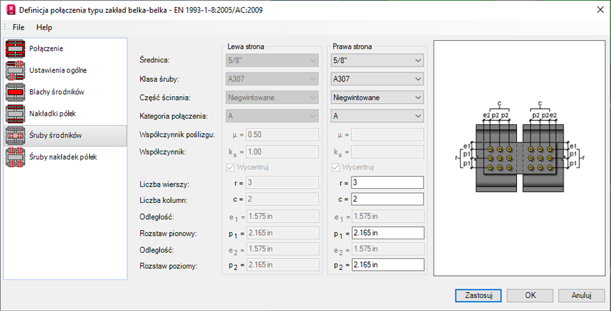 Panel Śruby środnika służy do definiowania parametrów śrub łączących nakładkę ze środnikami pręta.