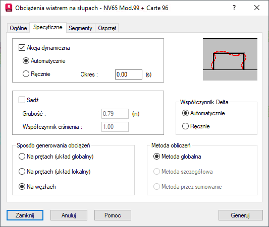 - Opcja Akcja dynamiczna wiatru — umożliwia włączanie/wyłączanie uwzględniania efektów dynamicznych podczas generacji obciążeń. Dodatkowo istnieje możliwość automatycznego uwzględnienia efektów dynamicznych przez program przy podanym okresie drgań własnych konstrukcji.