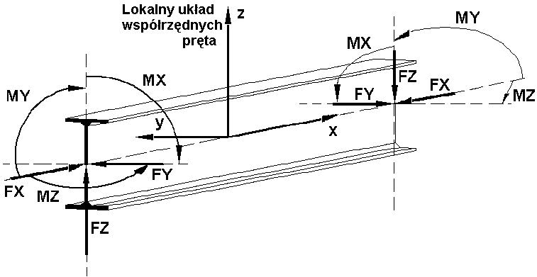 W programie konwencja znakowania w elementach prętowych oparta jest na konwencji sił przekrojowych. Zgodnie z tą zasadą siły przekrojowe są tego samego znaku, jeżeli wywołują taki sam efekt na końcu pręta, jak dodatnie siły węzłowe (siły, których kierunek zgadza się kierunkiem osi lokalnego układu współrzędnych) przyłożone w początkowym węźle pręta. Dodatnie momenty zginające MY powodują rozciąganie tych włókien belki, które znajdują się po ujemnej stronie lokalnej osi współrzędnych "z". Dodatnie momenty zginające MZ powodują rozciąganie tych włókien belki, które znajdują się po dodatniej stronie lokalnej osi współrzędnych "y".