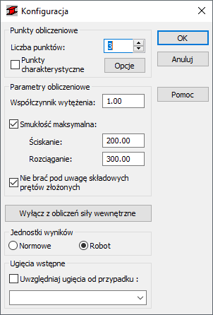 W środkowej części okna dialogowego znajduje się przycisk Wyłącz z obliczeń siły wewnętrzne, którego naciśnięcie powoduje otwarcie dodatkowego okna dialogowego Wyłączenie sił wewnętrznych; w oknie tym określone mogą zostać graniczne wartości sił wewnętrznych (pozwala to na pominięcie „nieistotnych” wartości sił dla konkretnego przekroju). Ponadto wybrane mogą zostać jednostki prezentacji wyników wymiarowania prętów. Wyniki mogą być prezentowane w jednostkach używanych w wybranej normie stalowej lub stosowanych w programie Robot.