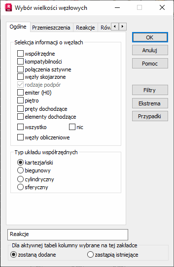 Po wybraniu karty Ogólne w oknie dialogowym Wybór wielkości węzłowych na ekranie pojawi się pokazane poniżej okno dialogowe, w którym prezentowane będą wartości należące do węzłów konstrukcji.