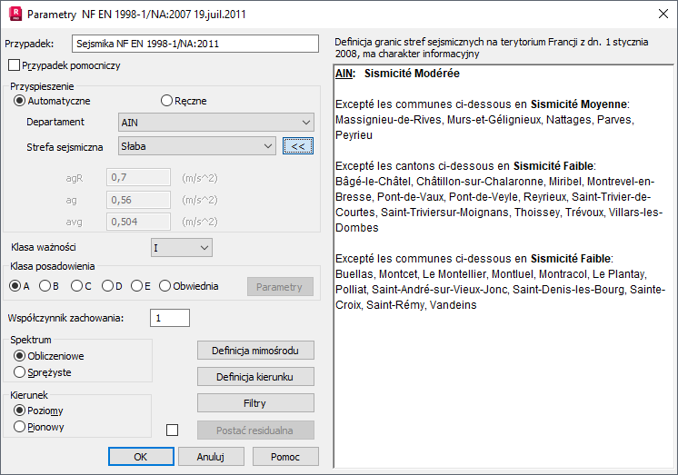 Po wybraniu opcji Automatycznie można określić wartości przyspieszenia odniesienia automatycznie przez określenie departamentu i strefy sejsmicznej. Kliknij przycisk >>, aby rozszerzyć listę stref dla wybranego departamentu. Definicja krawędzi stref sejsmicznych na terytorium Francji na dzień 1 stycznia 2008 r. wykonywana jest wyłącznie dla celów informacyjnych.